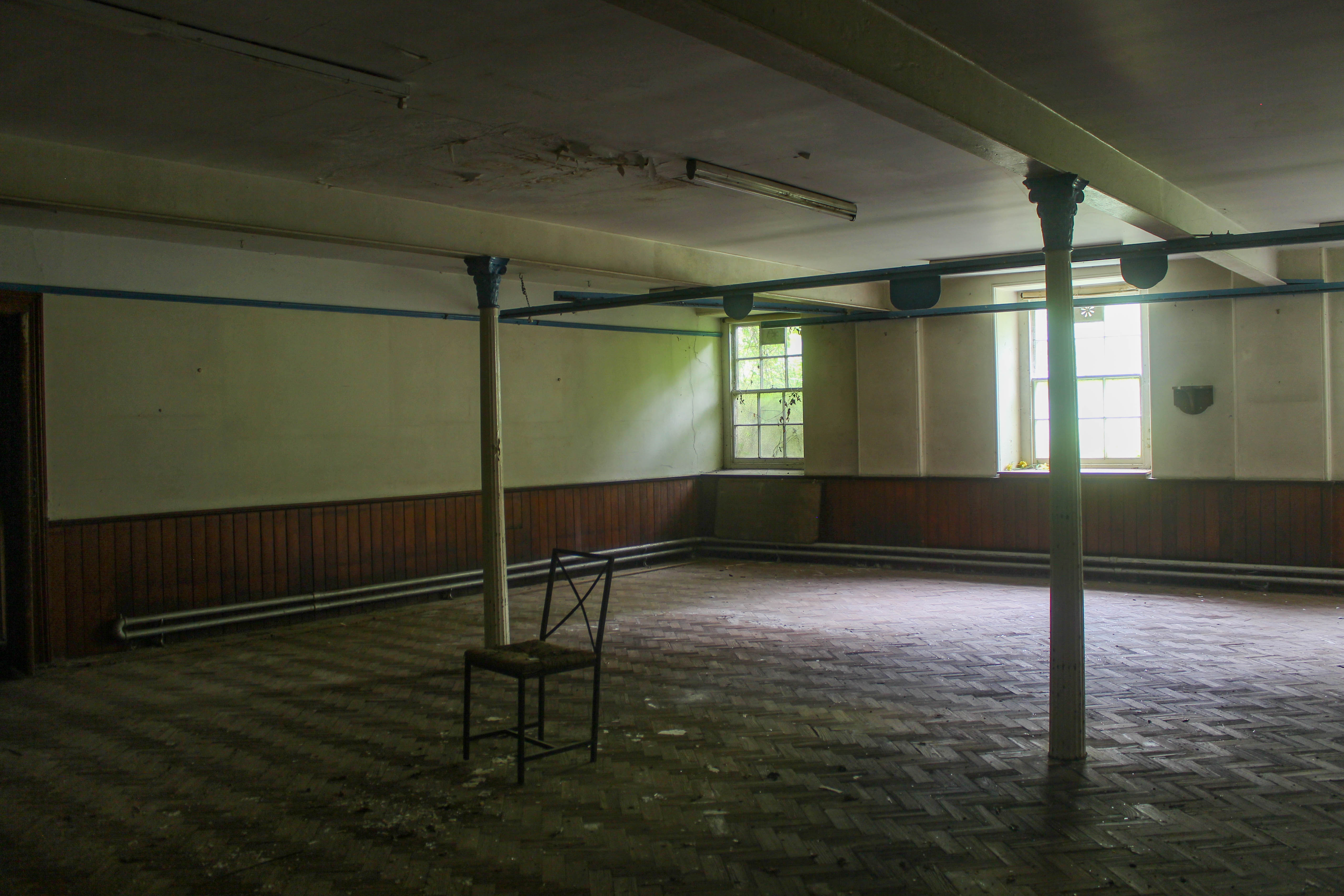 Evidently it's been cleared out, but it's fairly easy to imagine how this place would have been. The tables and benches are all neatly arranged around the sides, but presumably they would be brought into the centre of the hall and arranged for all the little crotchfruits activities.